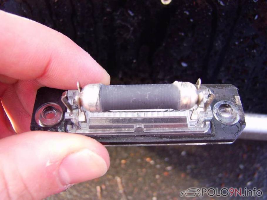 4. jeweils die beiden Schrauben der Kennzeichenbeleuchtung lösen und beide Kennzeichenleuchte rausnehmen. Die vorhandenen Soffitten durch die mitgelieferten Lastwiderstände ersetzen, die beiden Kennzeichenleuchten erstmal beiseite legen.