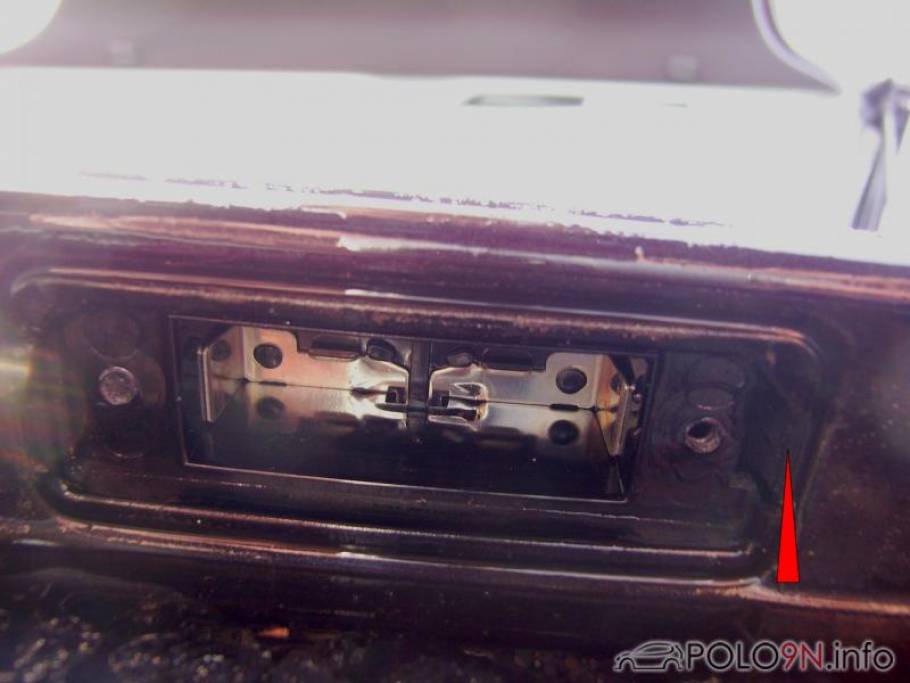 5. Eine der beiden Halterungen der Kennzeichenbeleuchtung muss rausgenommen werden. Hierfür mit einem Schlitz-Schraubendreher an der rechten Seite (siehe roter Pfeil) die Halterung vorsichtig raushebeln. Darauf achten, dass die Kunststoffnase der Halterung an dieser Seite nicht verbogen wird. Sie kann aber einfach wieder zurechtgebogen werden.