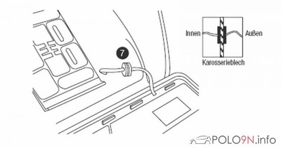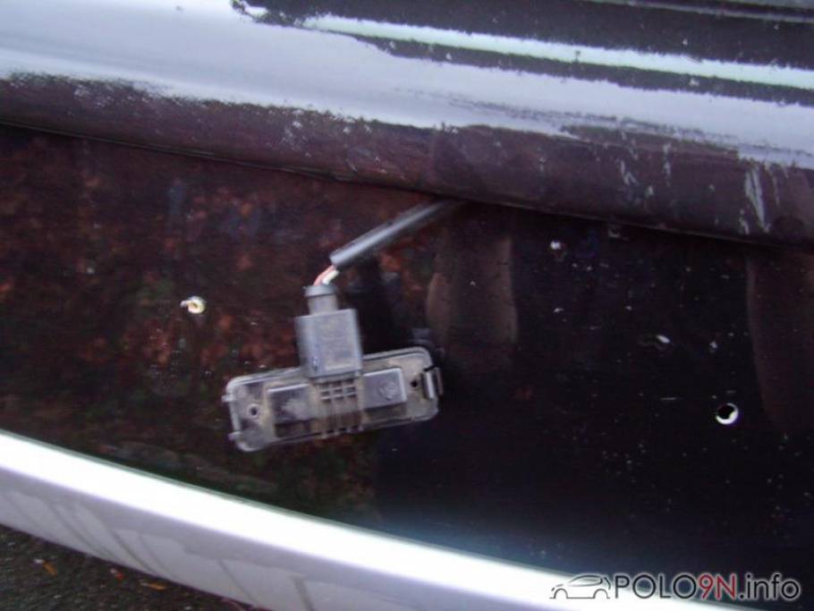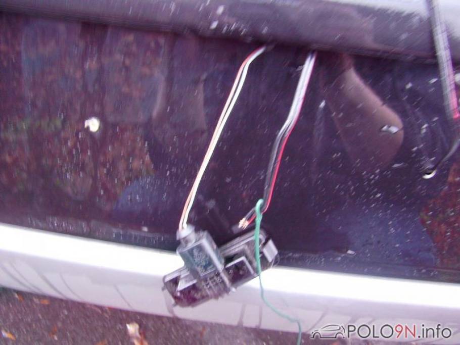 8. Stromkabel des SLN an ein Stück starren Draht befestigen und den Draht leicht rund biegen. Den Draht durch das Bohrloch führen, bis es durch die Aussparung der Kennzeichenbeleuchtung wieder herauskommt.