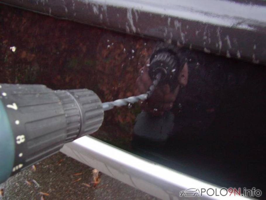 7. mit dem Akkuschrauber und dem Metallbohrer ein Loch in die Stoßstange bohren. Hierfür ist eine Stelle zu wählen, die später von dem Kennzeichen verdeckt wird.