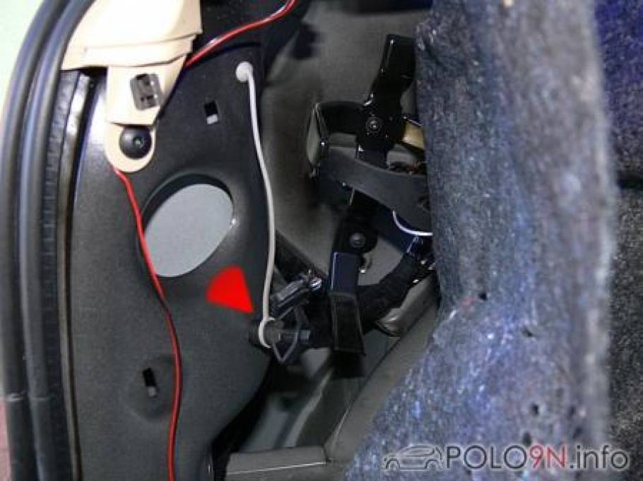 Die Plastikverkleidung heckseitig im Kofferraum ablösen. Dazu rechts und links oben nach innen aus den Klemmen ziehen, dann am Boden die Ecken und die Mitte Richtung Innenraum abziehen. Nun nach oben aus den restlichen Klemmen ziehen. Im Bild 1 sind die Befestigungspunkte markiert.