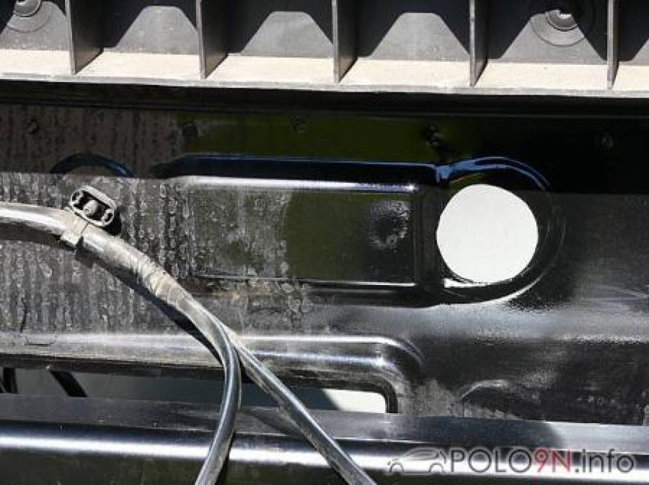 Greift man von unten an den Rahmen und tastet mit den Fingern, gibt der Unterbodenschutz an den vorhandenen Bohrungen nach. Diese nun freilegen und die AHK in Übereinstimmung mit den Löchern bringen. Auf der rechten Seite befindet sich an der hinteren Bohrung der Plastikstutzen von der Tankeinfüllung. Hier ist beim Festdrehen der Schraube Vorsicht geboten.