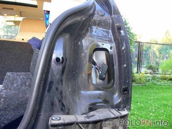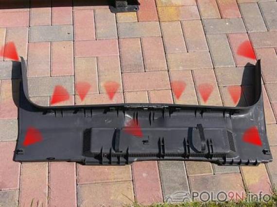 Die Plastikverkleidung heckseitig im Kofferraum ablösen. Dazu rechts und links oben nach innen aus den Klemmen ziehen, dann am Boden die Ecken und die Mitte Richtung Innenraum abziehen. Nun nach oben aus den restlichen Klemmen ziehen. Im Bild 1 sind die Befestigungspunkte markiert.