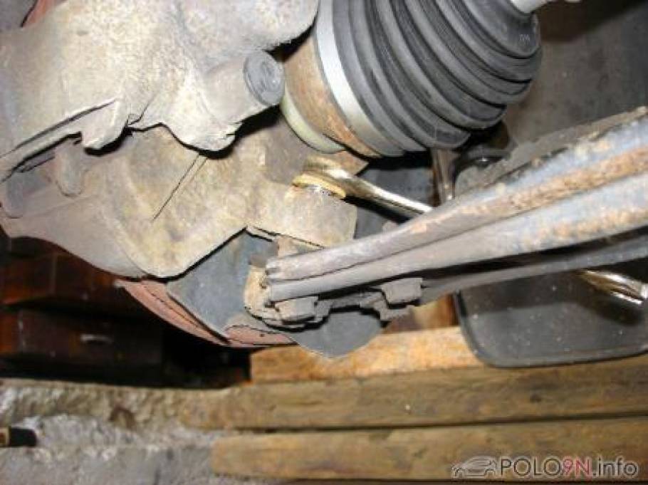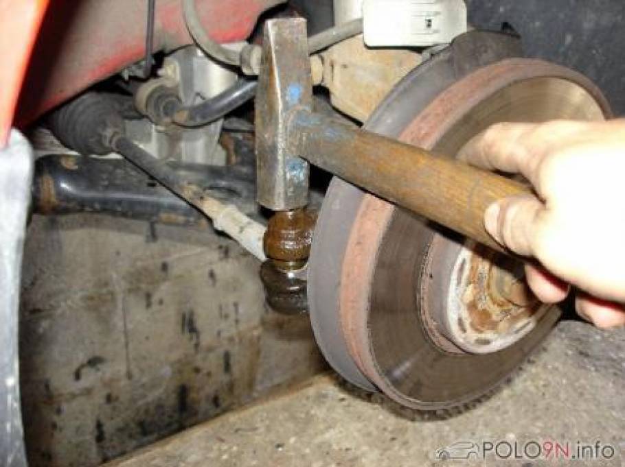 2.1.2 - Lösen vom Lenkgestänge: Diese Befestigungsstelle ist leicht von der Fahrzeugseite zugänglich. Hier kommt das selbe Prinzip wie beim Querlenker zum Einsatz - Kugelgelenk und konische Aufnahme. Also wieder Schraube entfernen und Querlenker aus der Aufnahme im Radlagergehäuse ziehen. Sollte es nicht auf Anhieb funktionieren, Mutter leichtgängig machen (entrosten und einölen), danach die Mutter wieder einige Umdrehungen auf die Schraube drehen (sodass das Gewinde der Schraube nicht verletzt werden kann) und mit ein paar Hammerschlägen (von oben auf die Mutter) die Lenkstange aus der konischen Aufnahme des Radlagergehäuses entfernen. Evtl. muss als Gegenmasse ein zweiter Hammer verwendet werden.