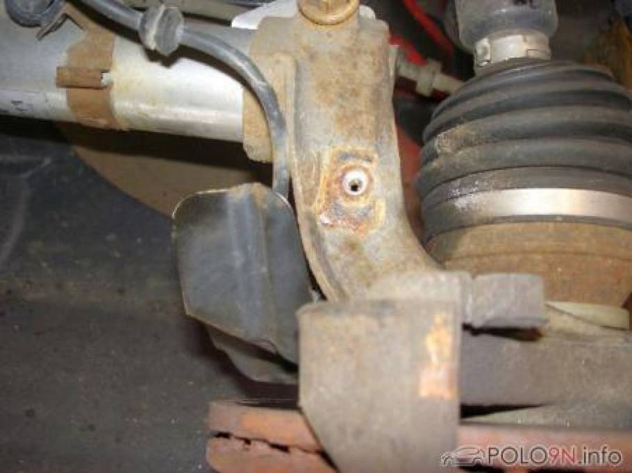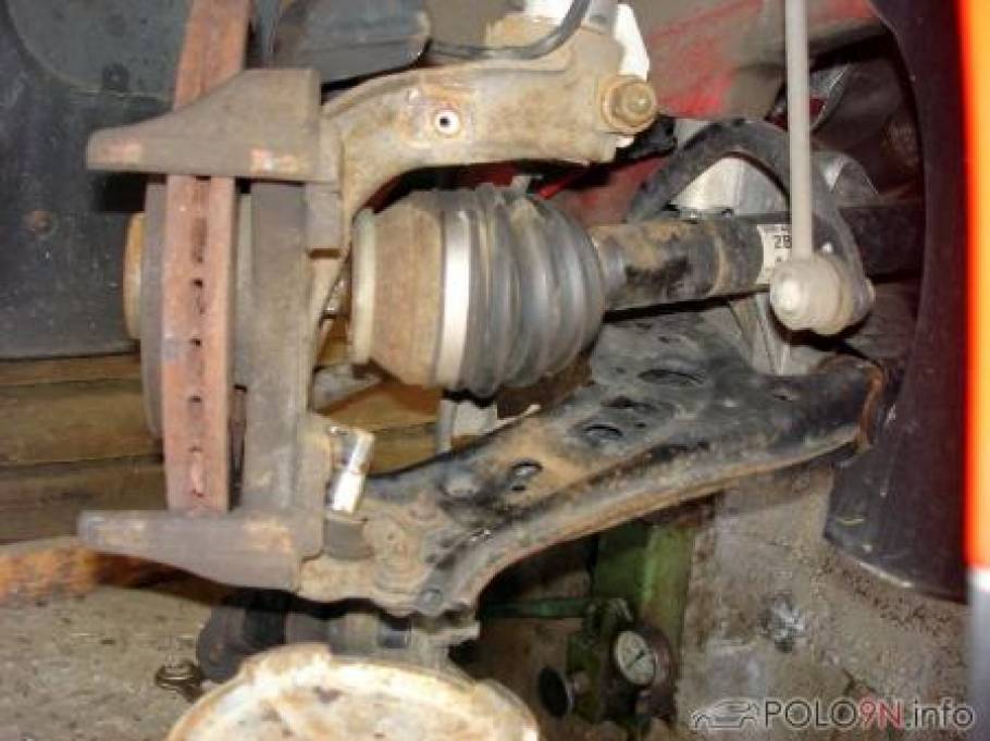 2.1 - Das Radlagergehäuse ist an 3 Punkten mit dem Fahrwerk verbunden - Querlenker (Dreieckslenker), Lenkgestänge, Federbein 2.1.1 - Lösen vom Querlenker: An die Befestigungsstelle des Radlagergehäuses am Querlenker kommt man am besten von unten ran. Das Kugelgelenk ist am Radlagergehäuse mit einer Mutter befestigt. Also zuerst Mutter entfernen (SW 18). Danach das Kugelgelenk aus der konischen Aufnahme ziehen. Sollte es nicht sofort lösbar sein so kann mit ein paar Hammerschlägen auf das Radlagergehäuse bzw. den Querlenker nachgeholfen werden. Vorsicht! Es darf kein Gewinde verletzt werden.