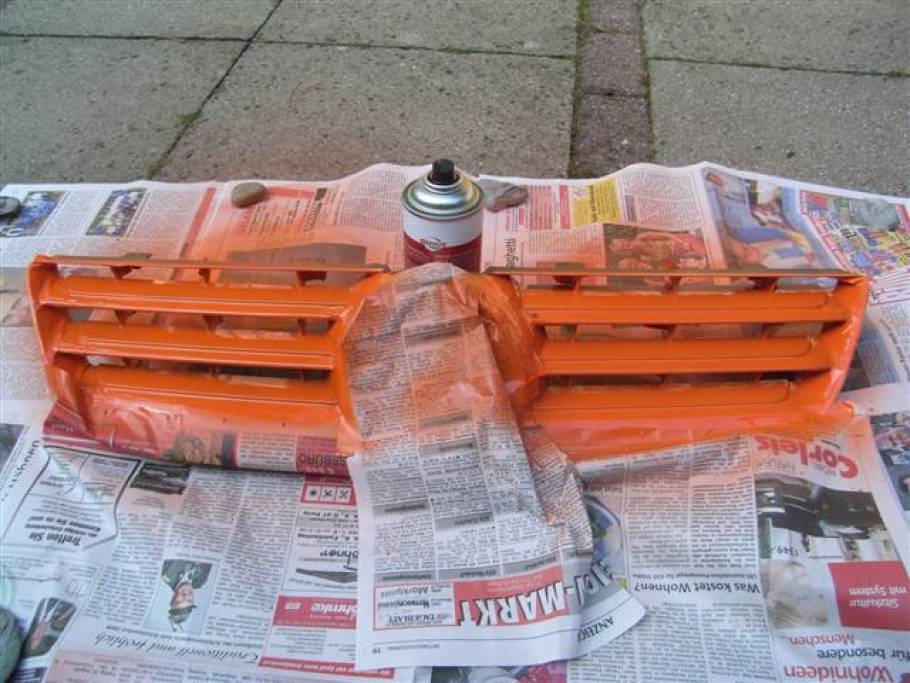Nun suchen wir uns eine gut belüftete Stelle und kleben eventuell noch mit Zeitung den restlichen Frontgrill ab, so dass wir hinterher nicht soviel saubermachen müssen.