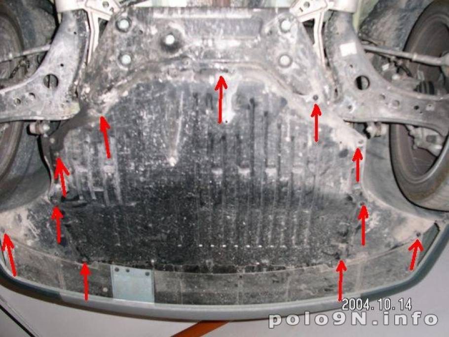 Danach wird der Motor und Dämmschutz unter dem Auto losgeschraubt (Rote Pfeile) und beiseite gelegt (Beim normalen Polo schon beim Ausbau des Spoilers geschehen).