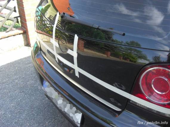 Wenn man sich nicht auf sein Augenmaß verlassen möchte, was die Ausrichtung des Emblems angeht, muss man sich etwas einfallen lassen. Ich habe dazu einfach Kreppband verwendet und es von einer Rückleuchtenkante zur anderen gespannt und mich dann daran im rechten Winkel Richtung Emblemmulde vorgearbeitet.