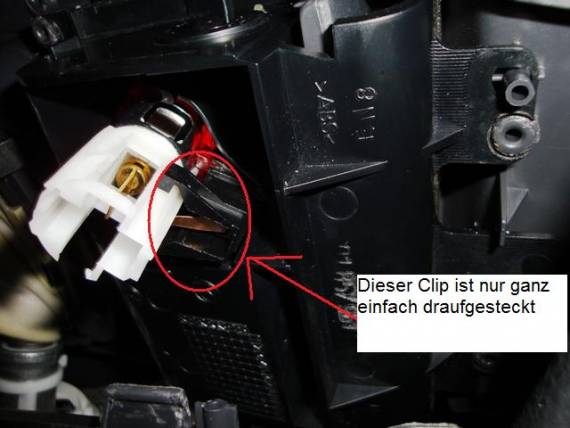 Ihr seht dann gleich diesen weißen Stecker, den ihr schon mal ohne Bedenken abstecken könnt. Nun den schwarzen Clip entfernen.