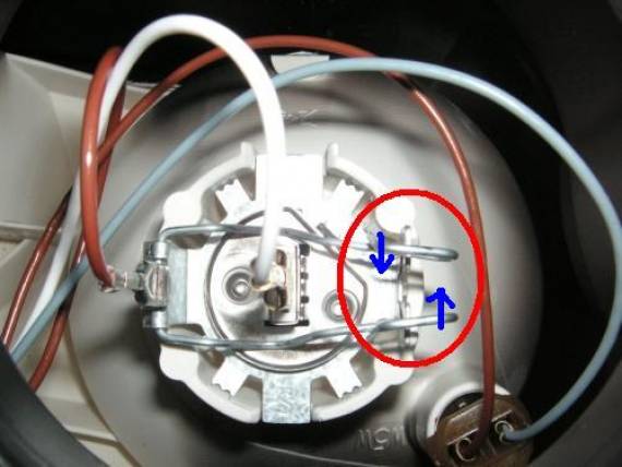 Die Fernlichtlampe ist eingehakt (roter Kreis). Diese Federklammern hakt man aus, indem man sie zusammendrückt (in Richtung der blauen Pfeile!)