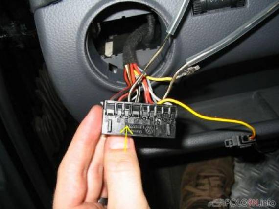Der sich in Kammer 7 (gelber Pfeil) des 17poligen Lichtschaltersteckers befindende Pin, Kabelfarbe gelb/lila, muss ausgestoßen werden und in das mitgelieferte Gehäuse gesteckt werden. Zum Entriegeln des Pins muss die Kunststoffrastnase von der Leitungsseite (grüner Pfeil) mittels eines kleinen Schraubendrehers vorsichtig angehoben werden bis es 'knackt' (nicht herausbrechen).