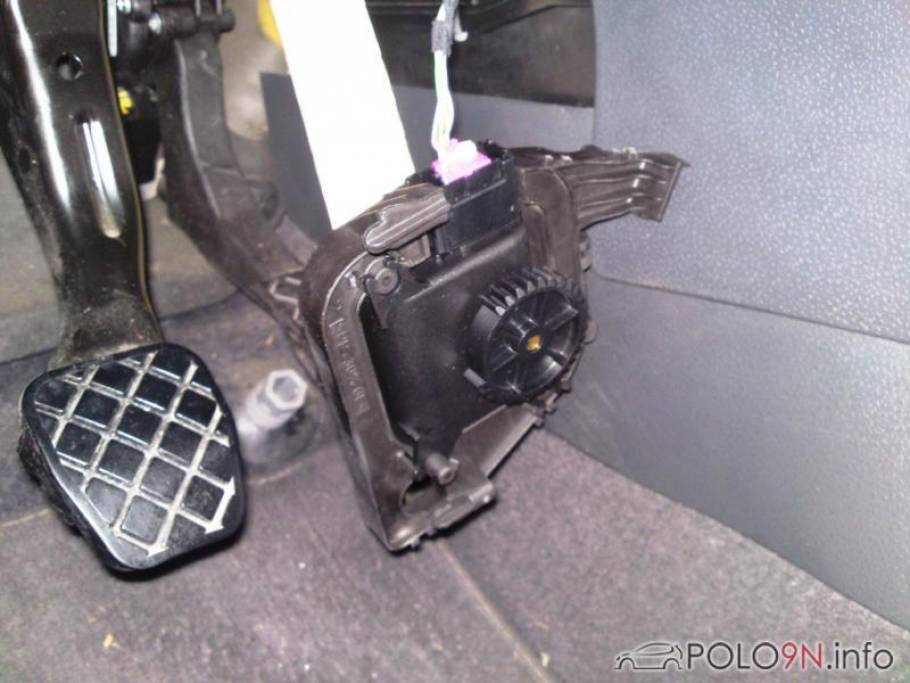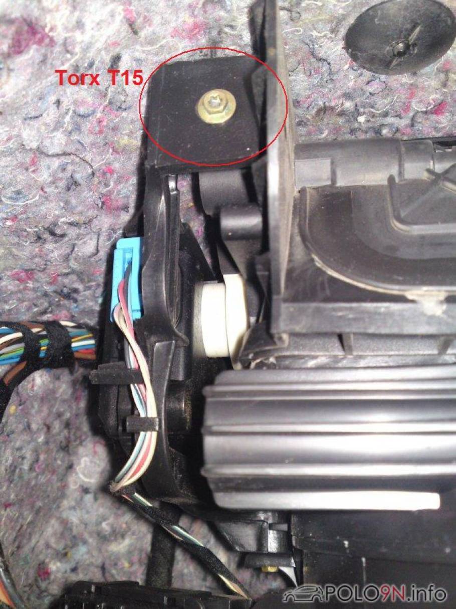So hängt er dann im Fußraum. Nur noch den blauen Stecker (kann je nach Modell auch rosa/pink sein) abziehen. Dann ist der Stellmotor mit Halter vollständig ausgebaut und schaut folgendermaßen aus: