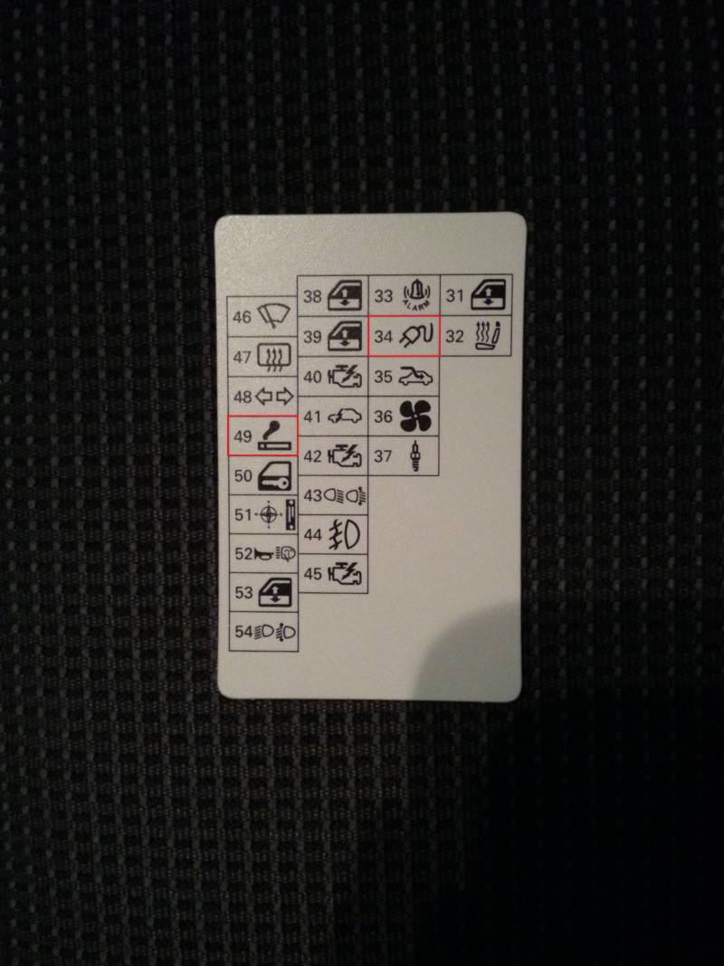 Wichtig sind die beiden rot umrandeten Sicherungen. Da wir erst gar nicht drauf gekommen sind, dass die Zigarette (49) für den Zigarettenanzünder vorne ist und der Stecker (34) für die Steckdose im Kofferraum hinten ist.