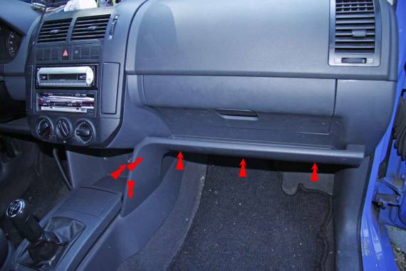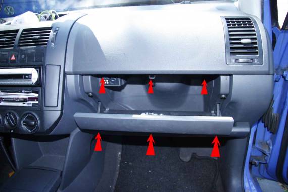 Handschuhfach ausbauen. Nachdem das Ablagefach ausgebaut wurde, kommen drei weitere Schrauben am unteren Bereich des Handschuhfaches zum Vorschein. Handschuhfach öffnen und die drei innenliegenden Schrauben ebenfalls herausdrehen (rote Pfeile).