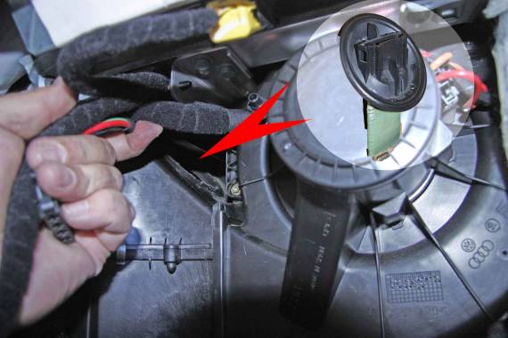 Nachdem man Dämmmatten zur Seite geschoben hat, kommt das Gebläse zum Vorschein. Man etwas Gefühl und Fummelei kann man nun den Vorwiderstand direkt mit einer kleinen Linksdrehung aus dem Gebläsegehäuse herausdrehen (rote Pfeile).
